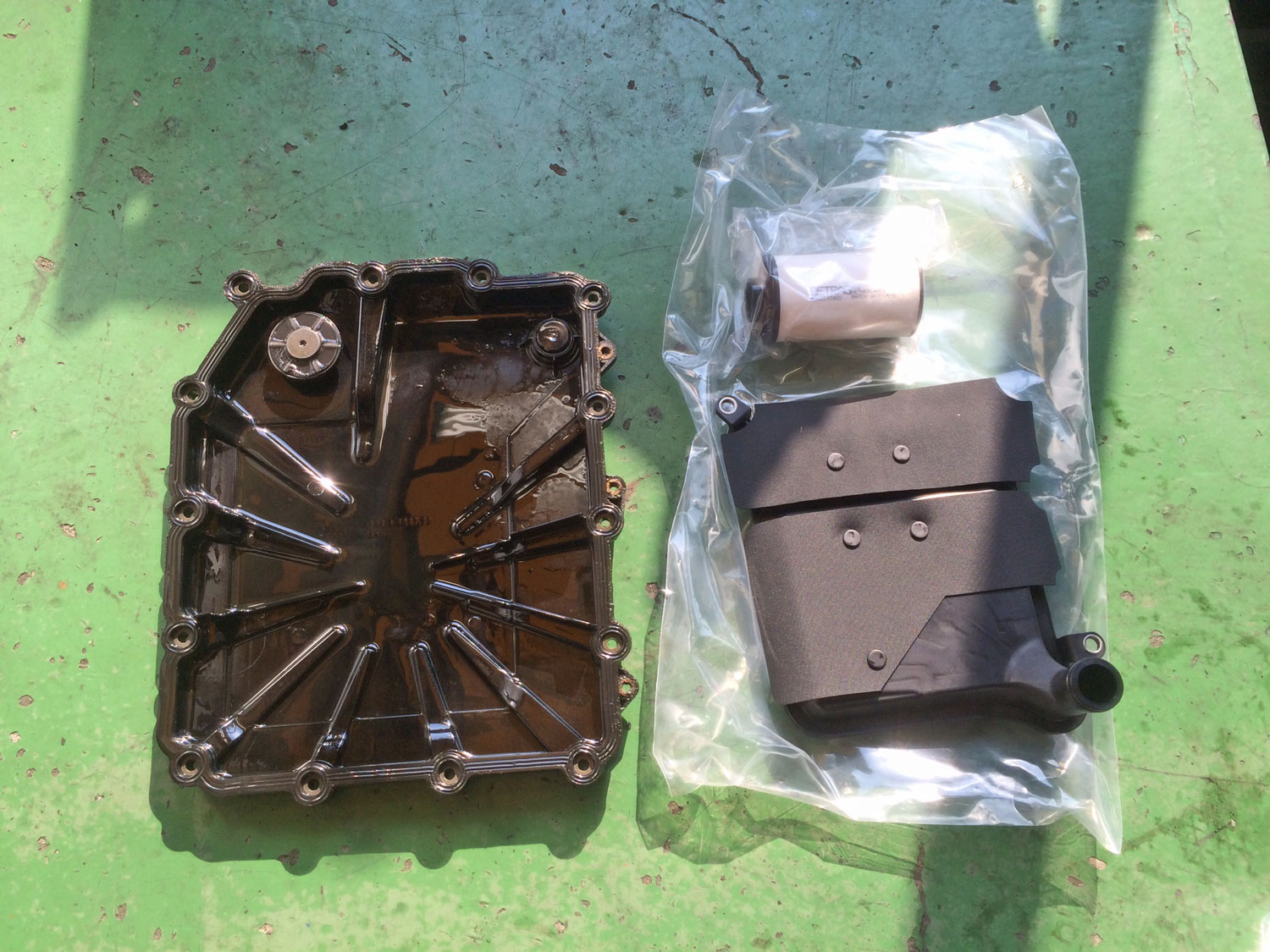 オイルパンは新品交換をして、右側のメインフィルターと加圧フィルターを同時交換します。